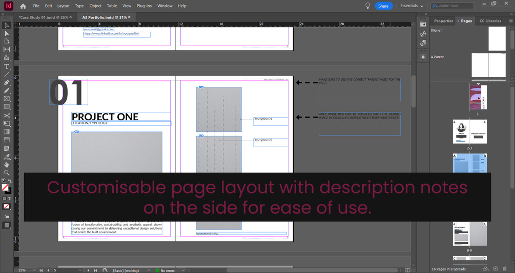 - Versatile Layouts: From project showcases and case studies to parent pages and automated table of contents, our templates cover all aspects of architectural portfolio presentation, catering to both digital and print formats.